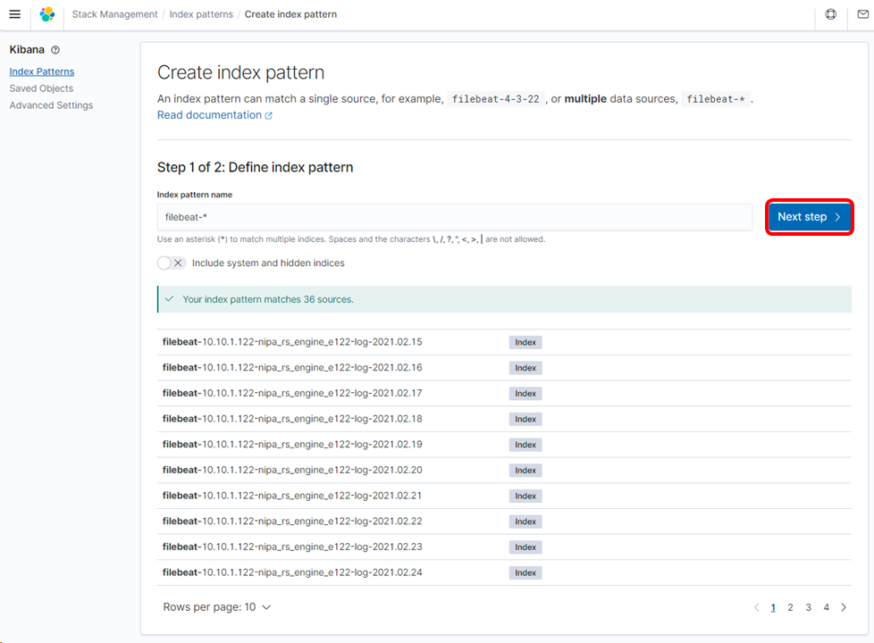 index pattern name을 입력한 후 Next step을 클릭합니다. (asterisk * 지원)