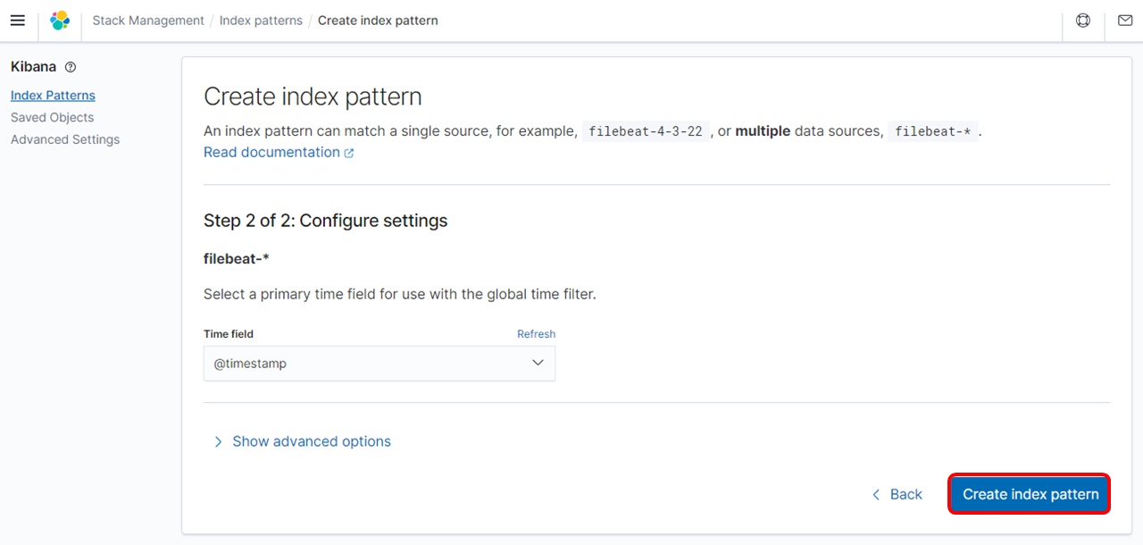 여기서 중요한 점은 Time field 설정입니다. 기본 날짜 필드를 자동적으로 부여되는 생성날짜로 사용할지 로그 내에 존재하는 사용자 날짜 필드를 사용할지 선택합니다.