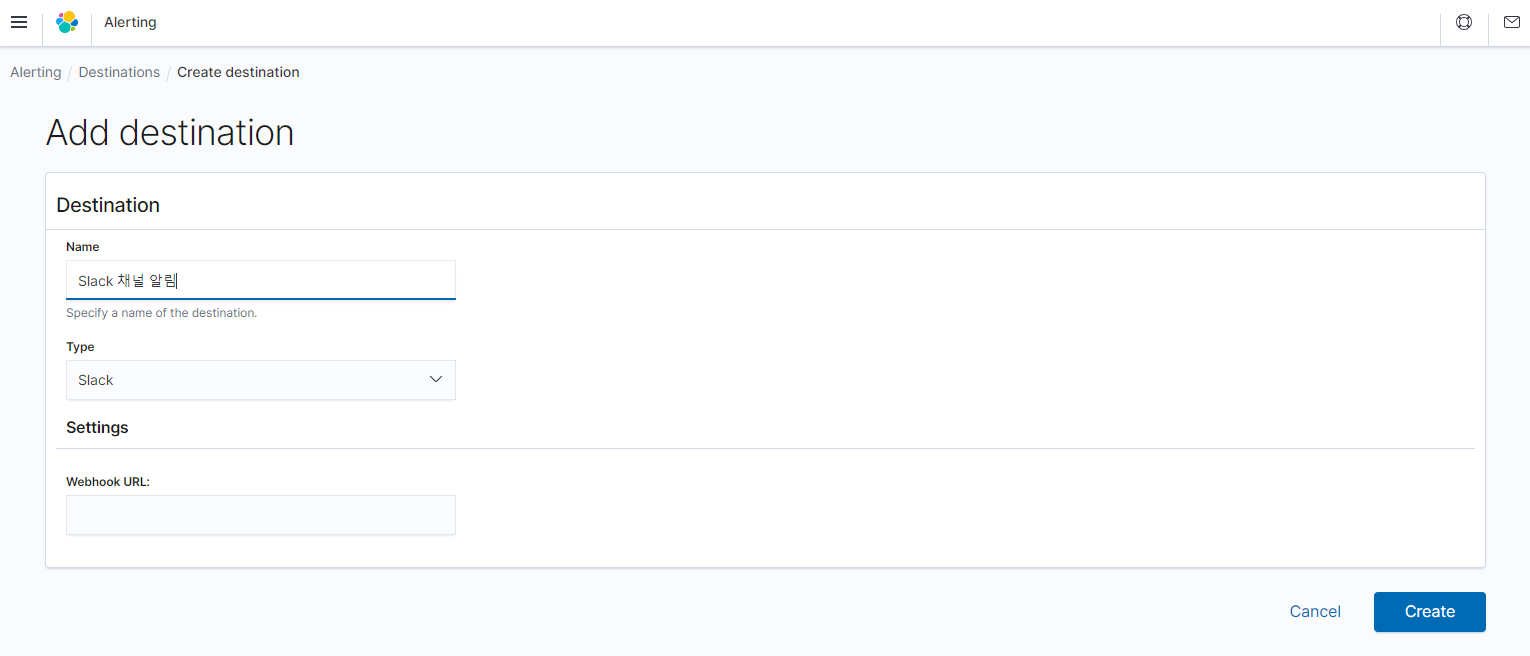Name, Type 을 선택하고 slack의 경우 Webhook URL을 입력합니다. (슬랙뿐만아니라 이메일, custom webhook 도 지원합니다.)