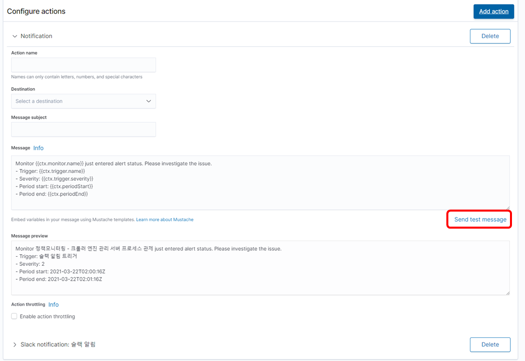 마지막으로 Configure actions 를 설정합니다. Action name을 입력하고 아까 생성한 destination을 선택합니다.